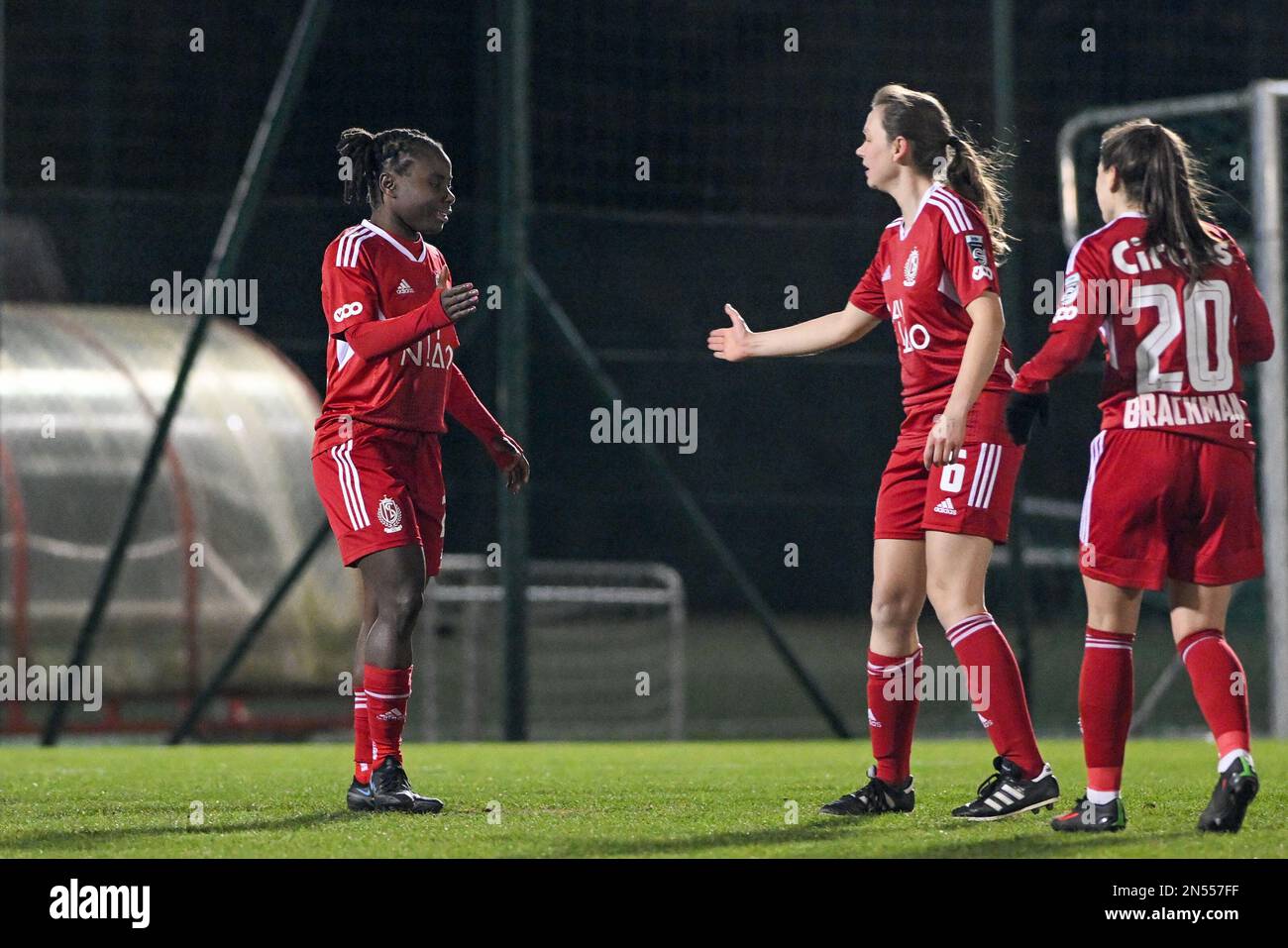 Luttich Belgien 8 Februar 2023 Welma Fon 22 Von Standard Pictured Feiert Mit Teamkollegen Nachdem Sie Wahrend Einer Wiederholung Eines Fussballspiels Zwischen Standard Femina De Liege Und Sv Zulte Waregem Ein Tor Geschossen